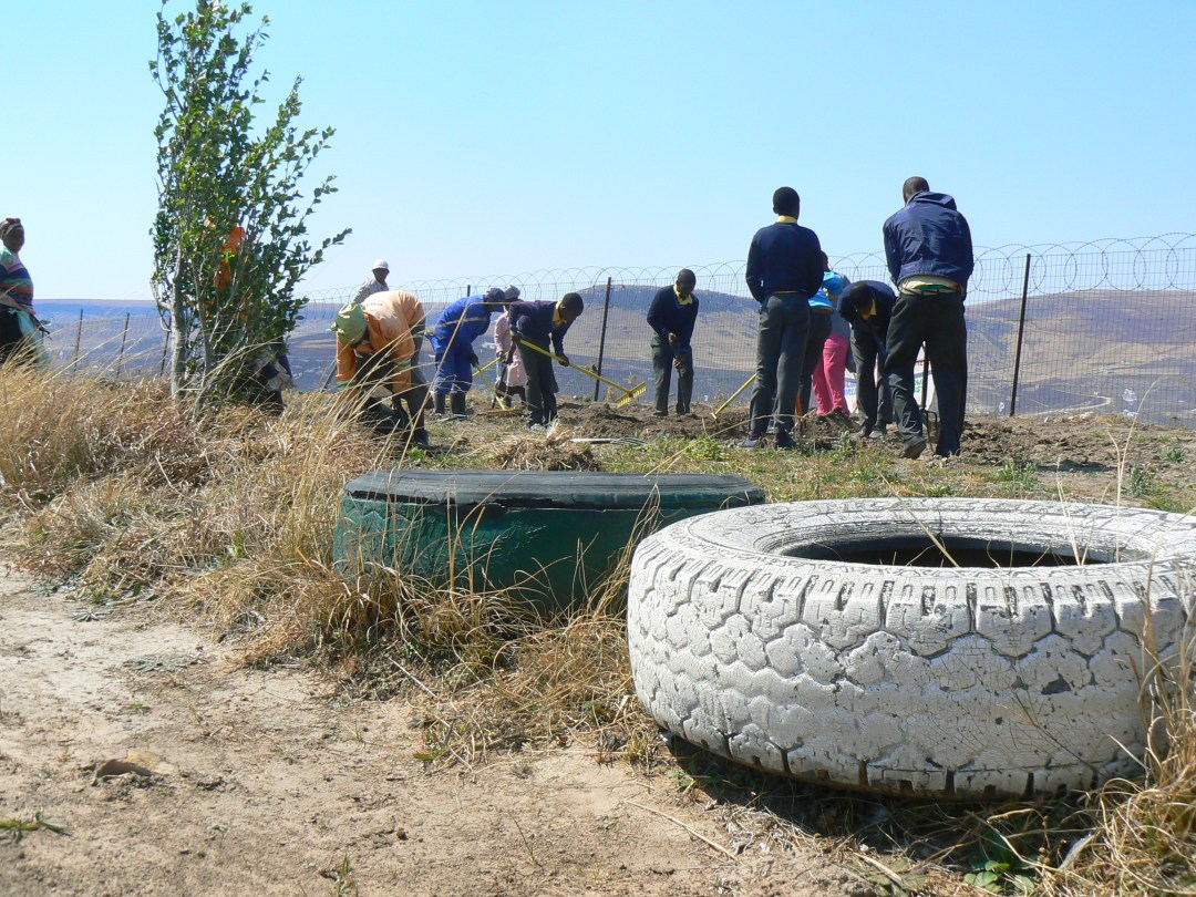 Liza, who coordinated the garden team, describes, how, “at the end of winter, the weather was really changeable. There’d been a bad fire the day before that’d come up to the edge of the school. But still, people from community came to work with the garden to turn the soil.” Working in tandem, students visitors and villagers trekked back and forth across the street to gather up manure from a neighbor’s cattle kraal to work into the soil. The LAND Project provided seed packets and volunteers made a potting mix out of finely blended kraal manure and soil. The students planted a lot of seedlings and put them in an area protected from the wind, while the locals planted seeds directly into the garden soil